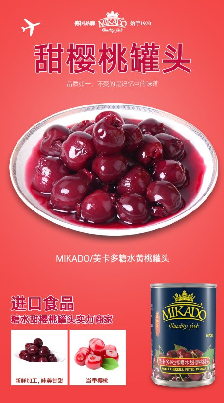 名称:美卡多欧洲糖水甜樱桃罐头配料:甜桃,水,白砂糖,柠檬酸原产国:保加利亚